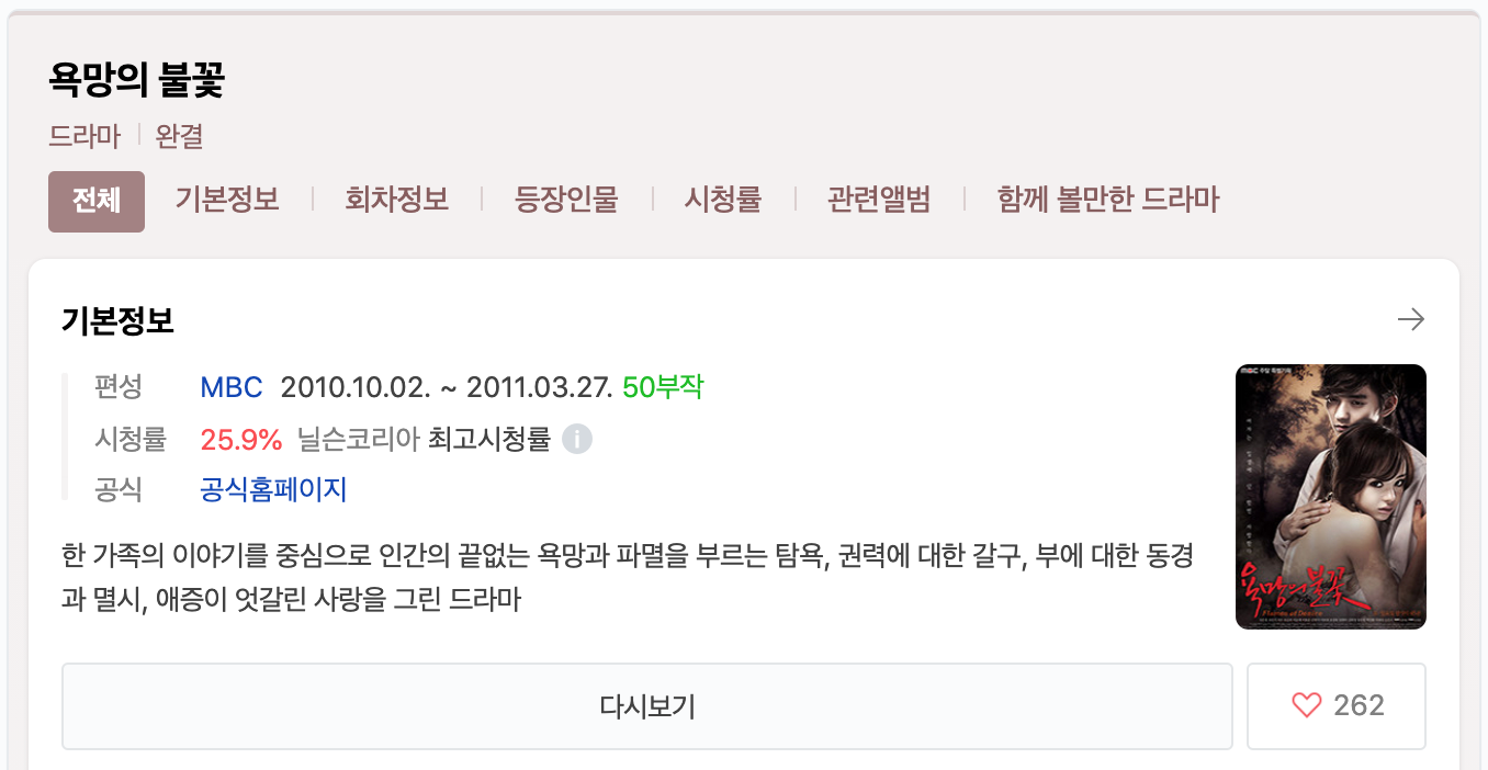 '욕망의 불꽃'은 2010년 10월 ~ 2011년 3월까지 MBC를 통해서 방영했던 드라마인데, 당시 최고시청률이 26%까지 올라갔었던 인기드라마였다.