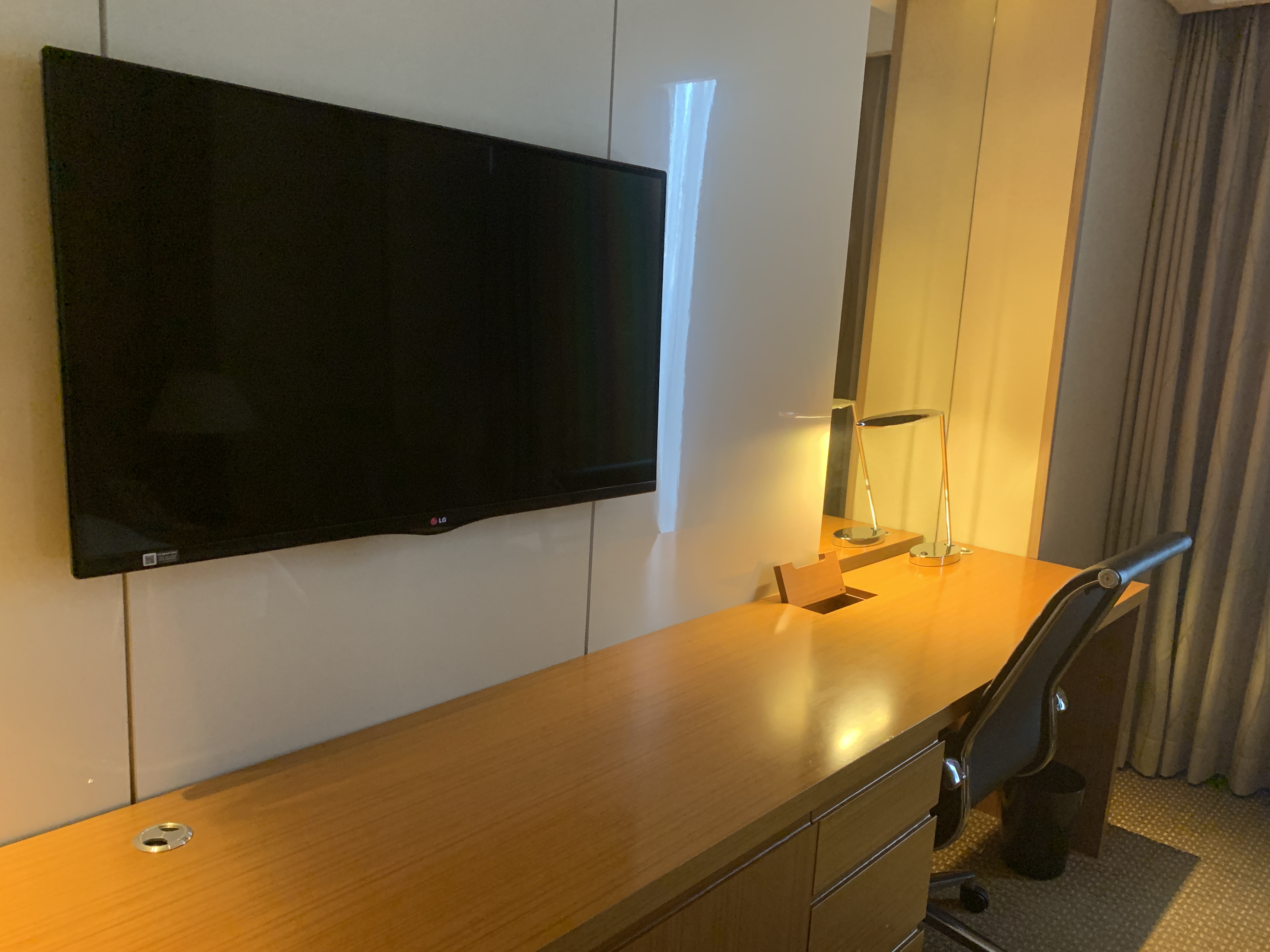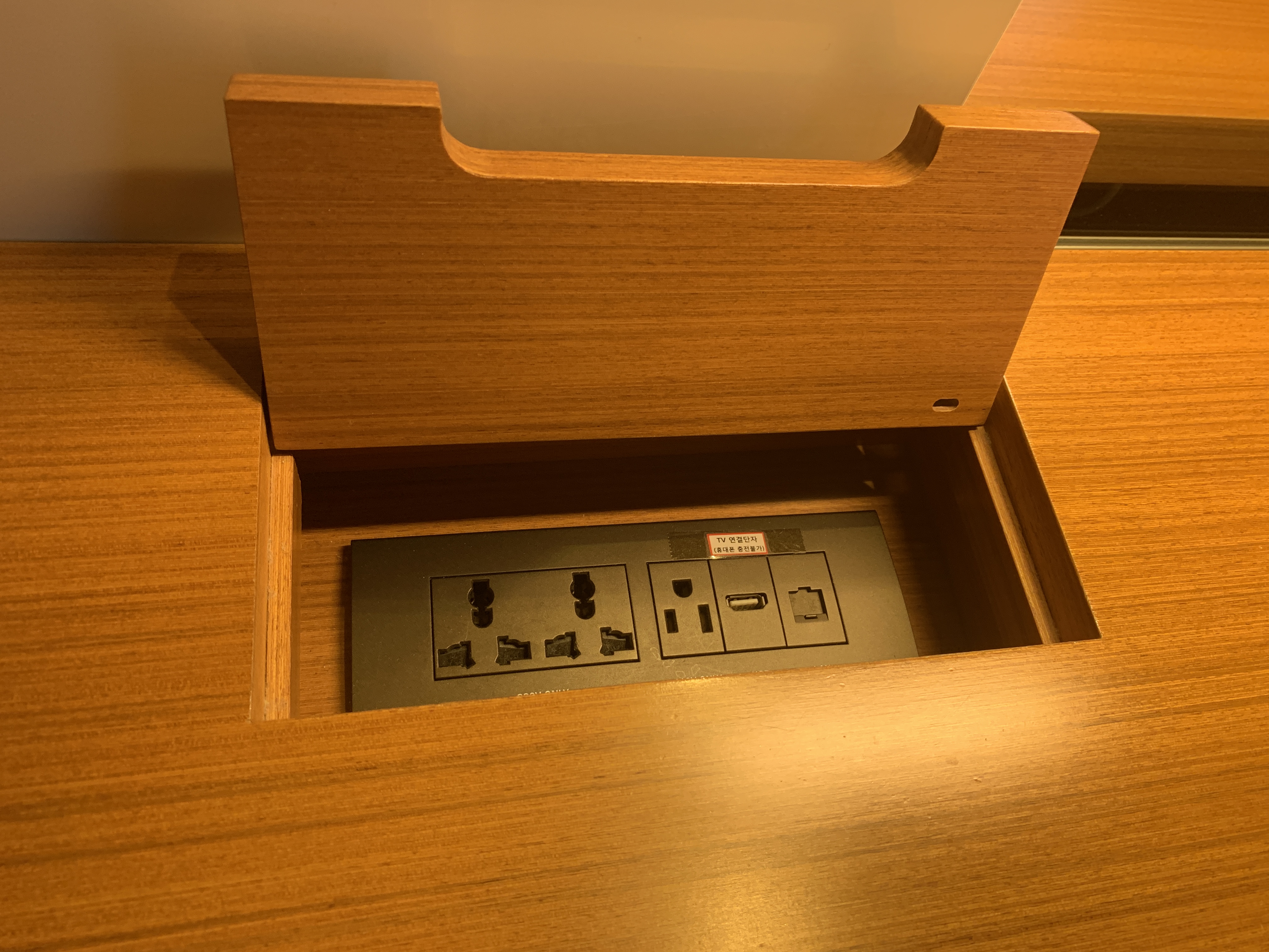 책상에는 220V 콘센트 두 개와 110V 콘센트 한 개, HDMI 포트, 랜포트가 있다.