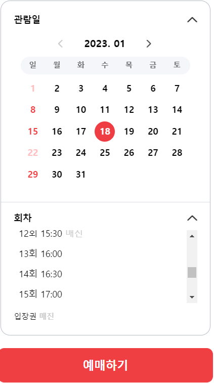 그래서, 미리 원하는 시간에 예매하고 싶으면, 위 일정과 같이 1월 2일, 1월 16일 10시에 2월달 예매를 재빠르게 진행하면 된다.