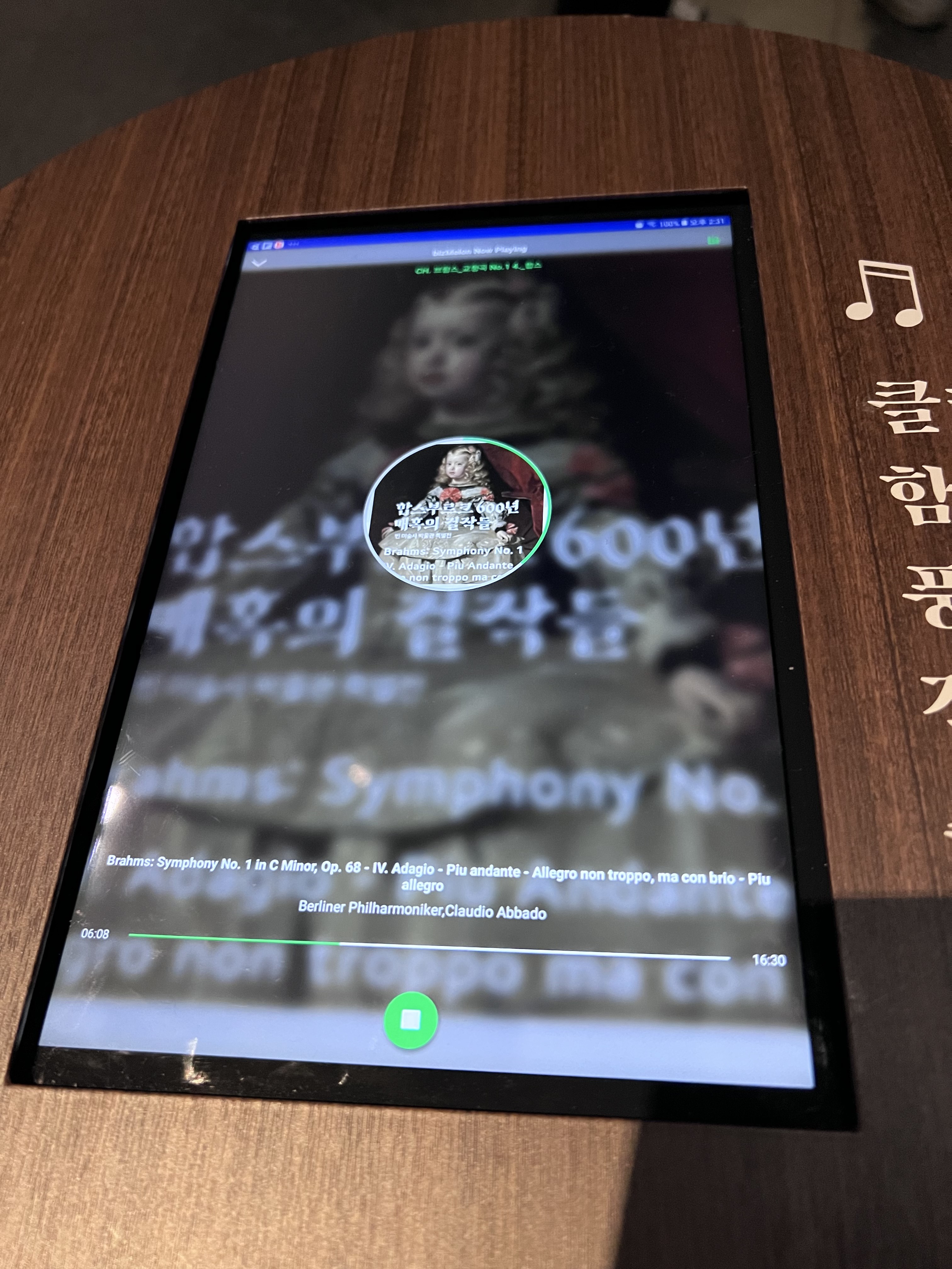 베를린 필하모닉(Berliner Philharmoniker)의 브람스 교향곡 제1번 C단조 Op. 68(Brahms Symphony No. 1 in C Minor, Op.68)이 흐르고 있다.
