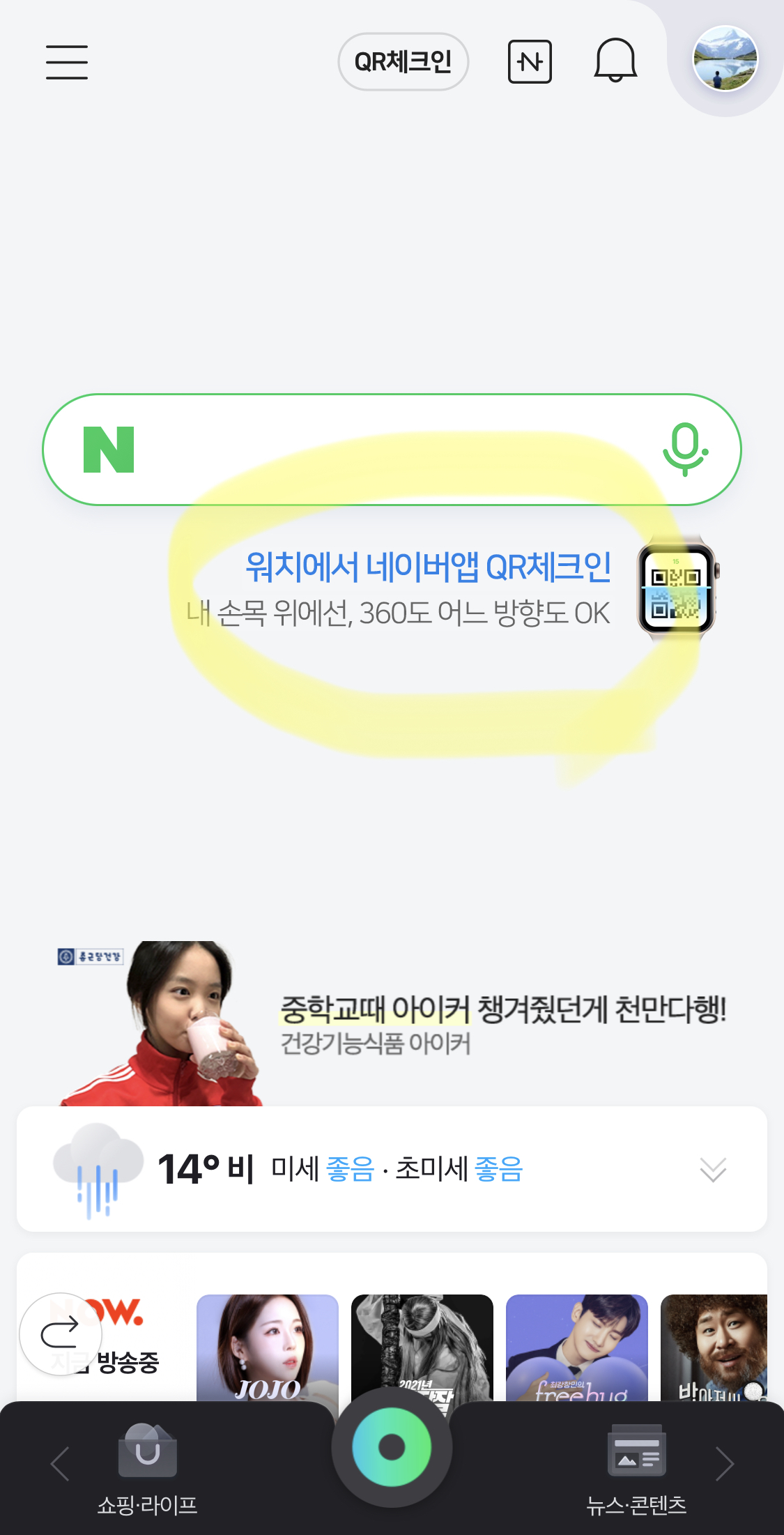 네이버앱에서도 QR체크인 기능을 홍보하고 있네요!
