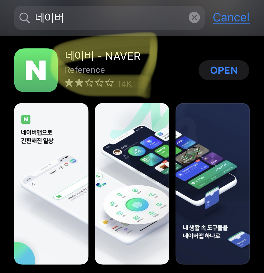 일단 요 기능을 써보기 위해서는 네이버앱이 필요하겠죠? 아직 설치하지 않으셨다면 앱스토어에 가서 ‘네이버’를 검색하고 설치합니다.