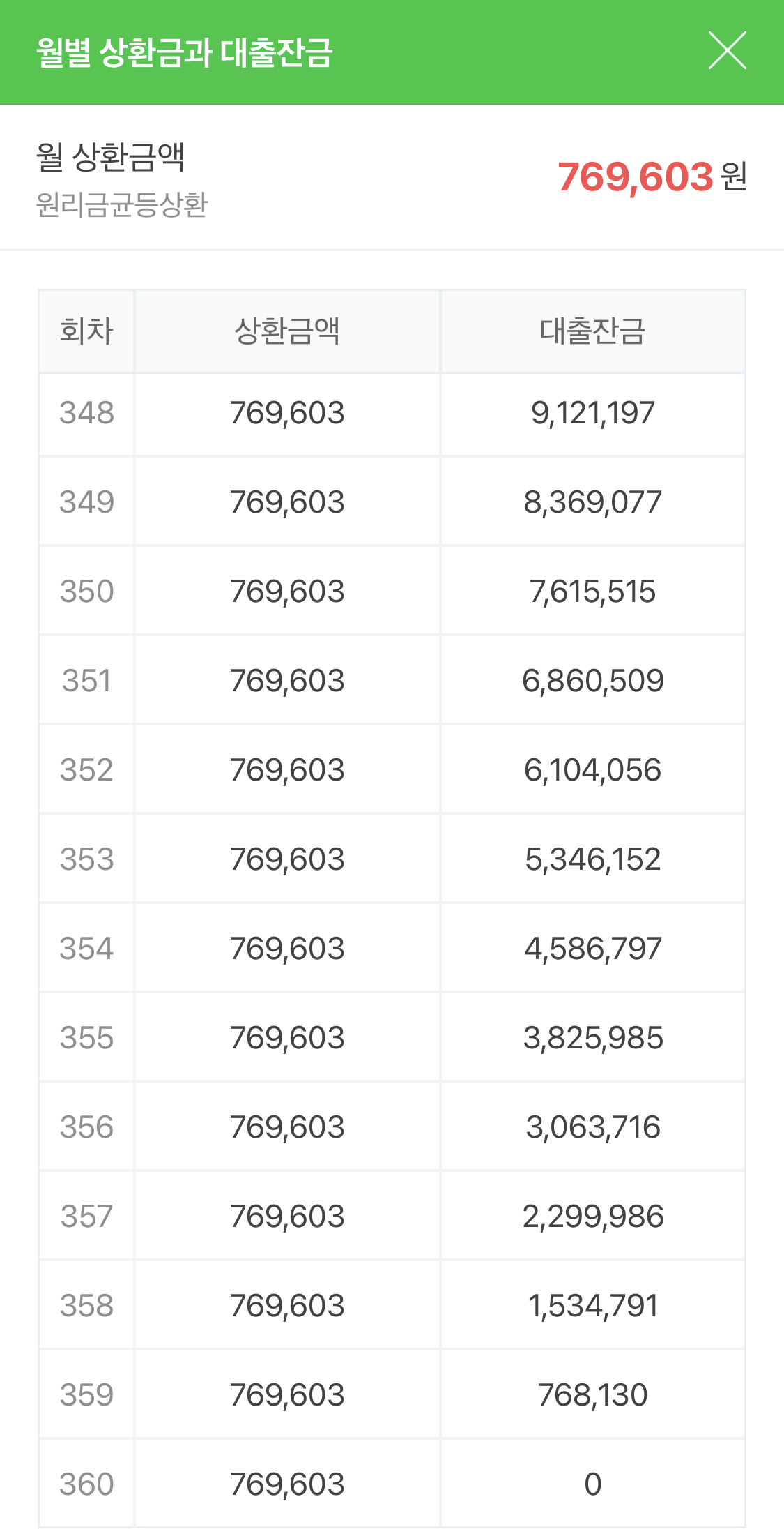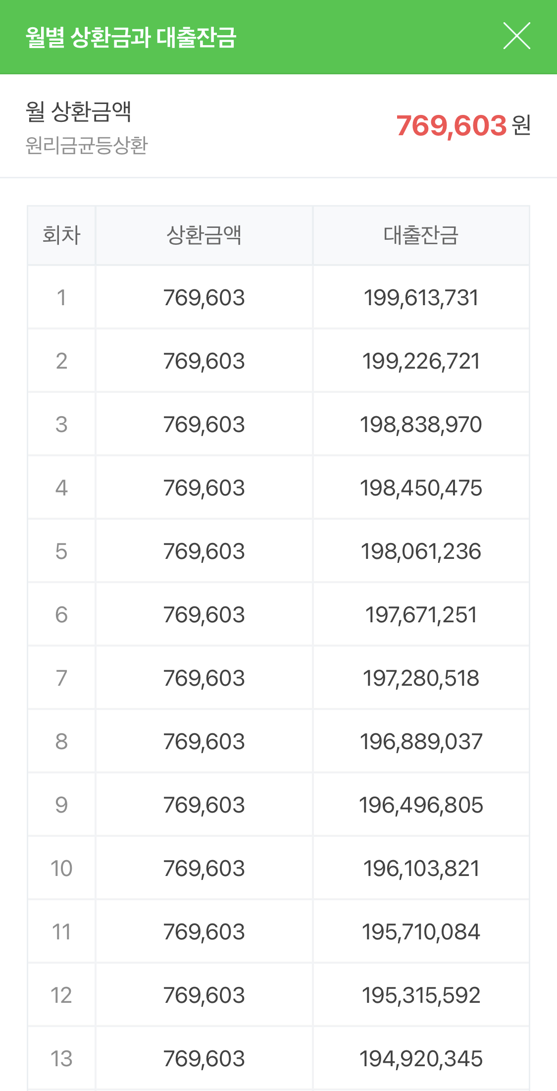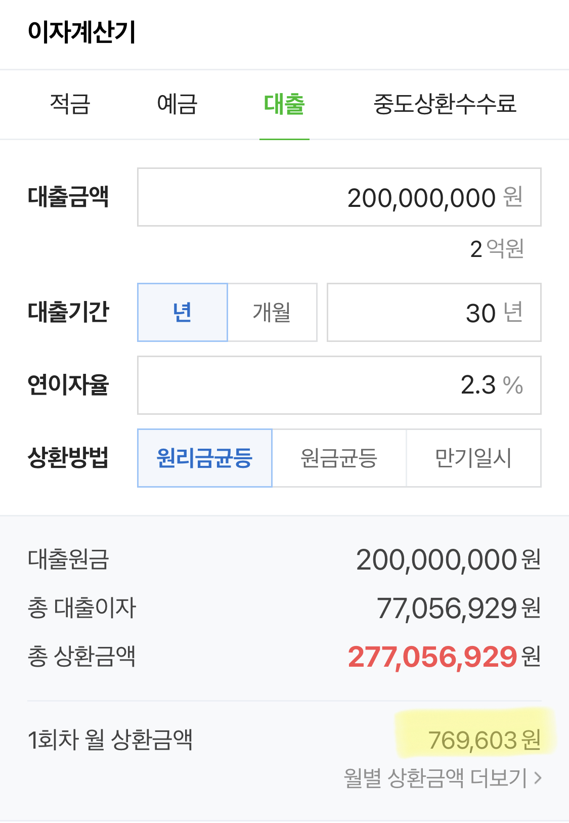 1회차 월 상환금액 : 769,603원