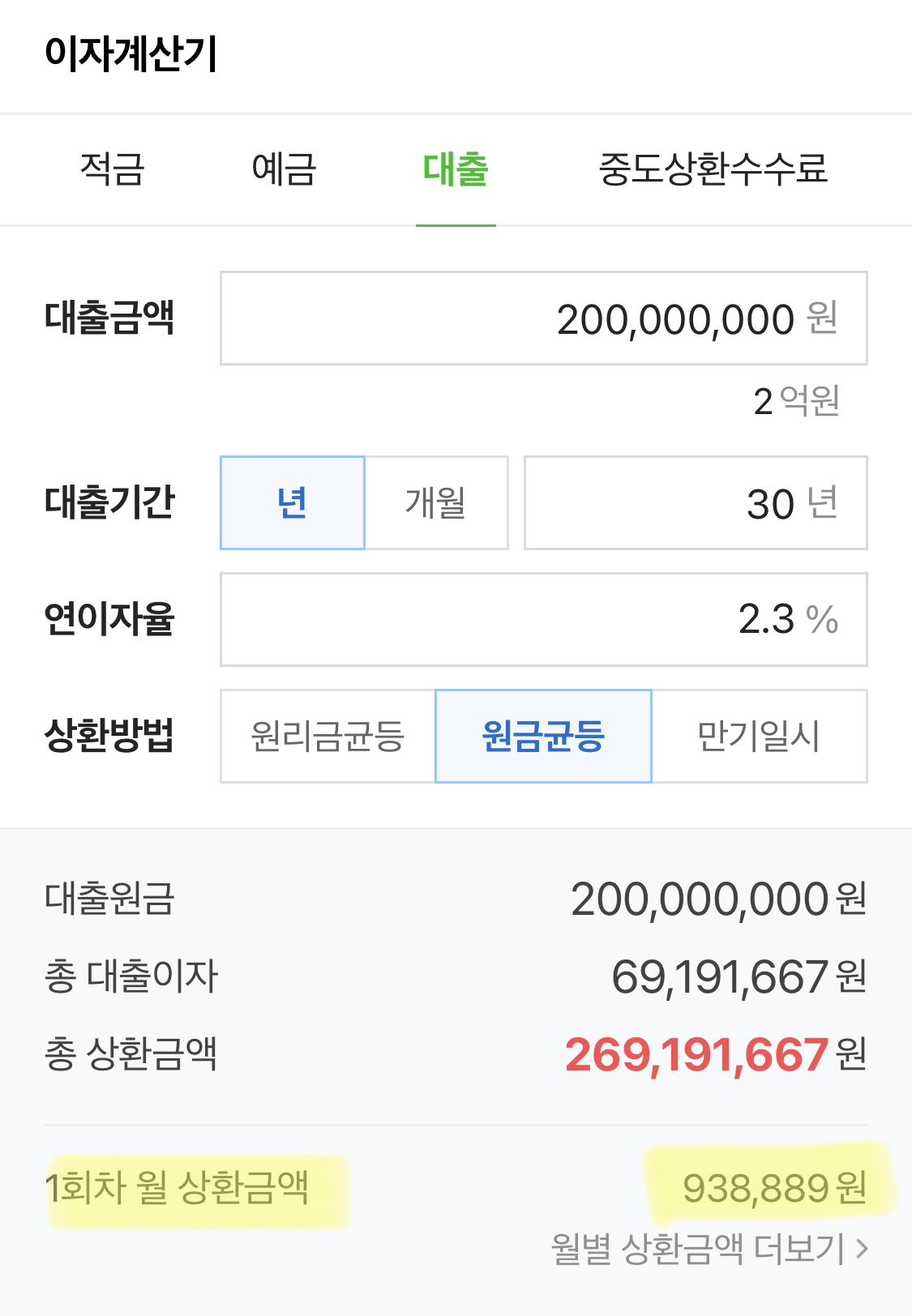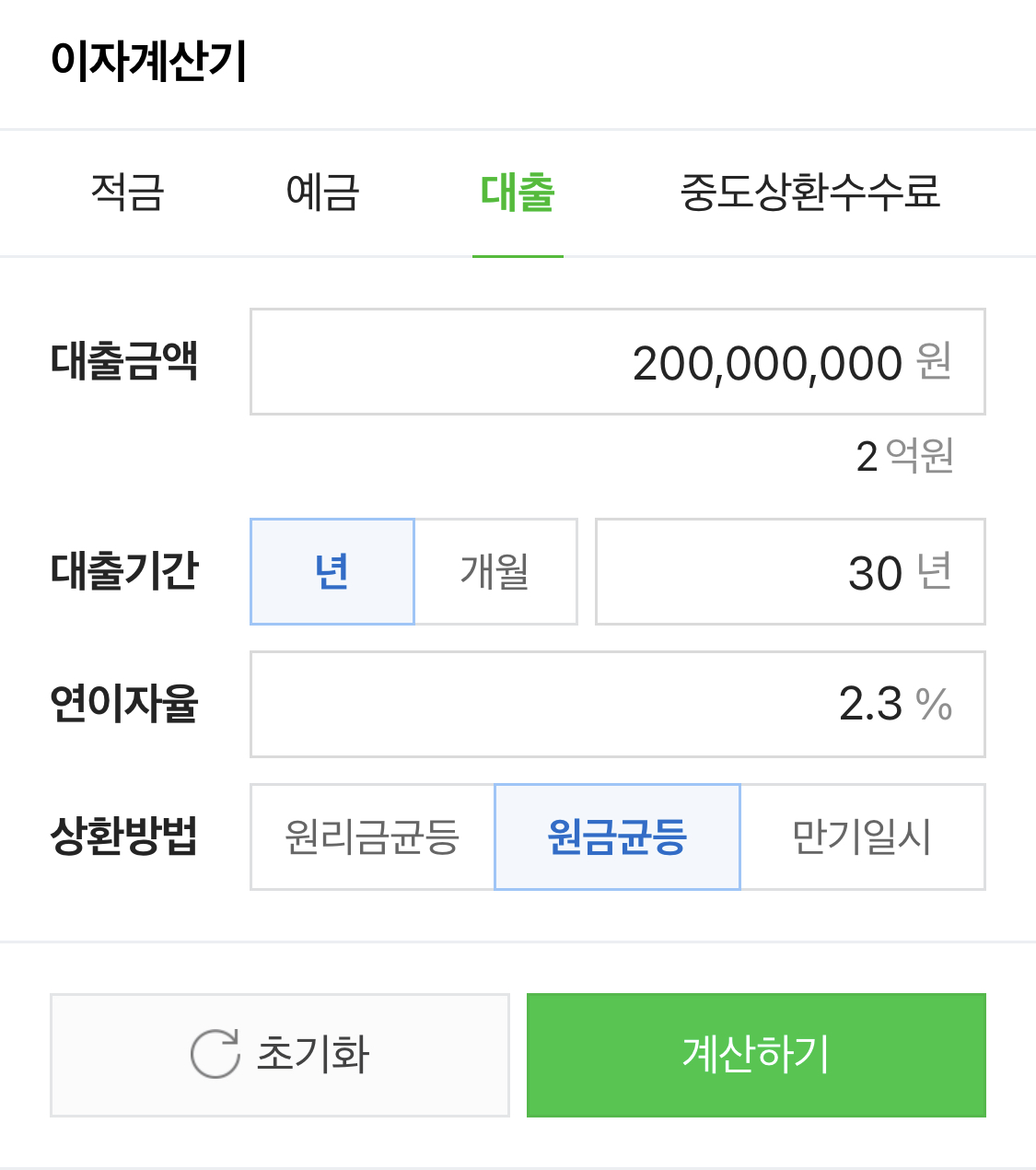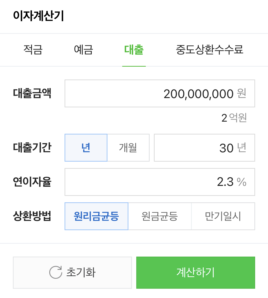 대출받을 금액을 2억원, 대출금리는 2.3%, 상환기간은 30년, 원리금균등상환 이라고 가정하고 실행해보자.