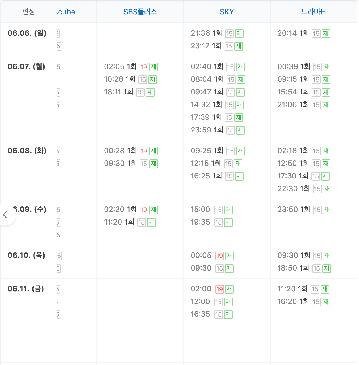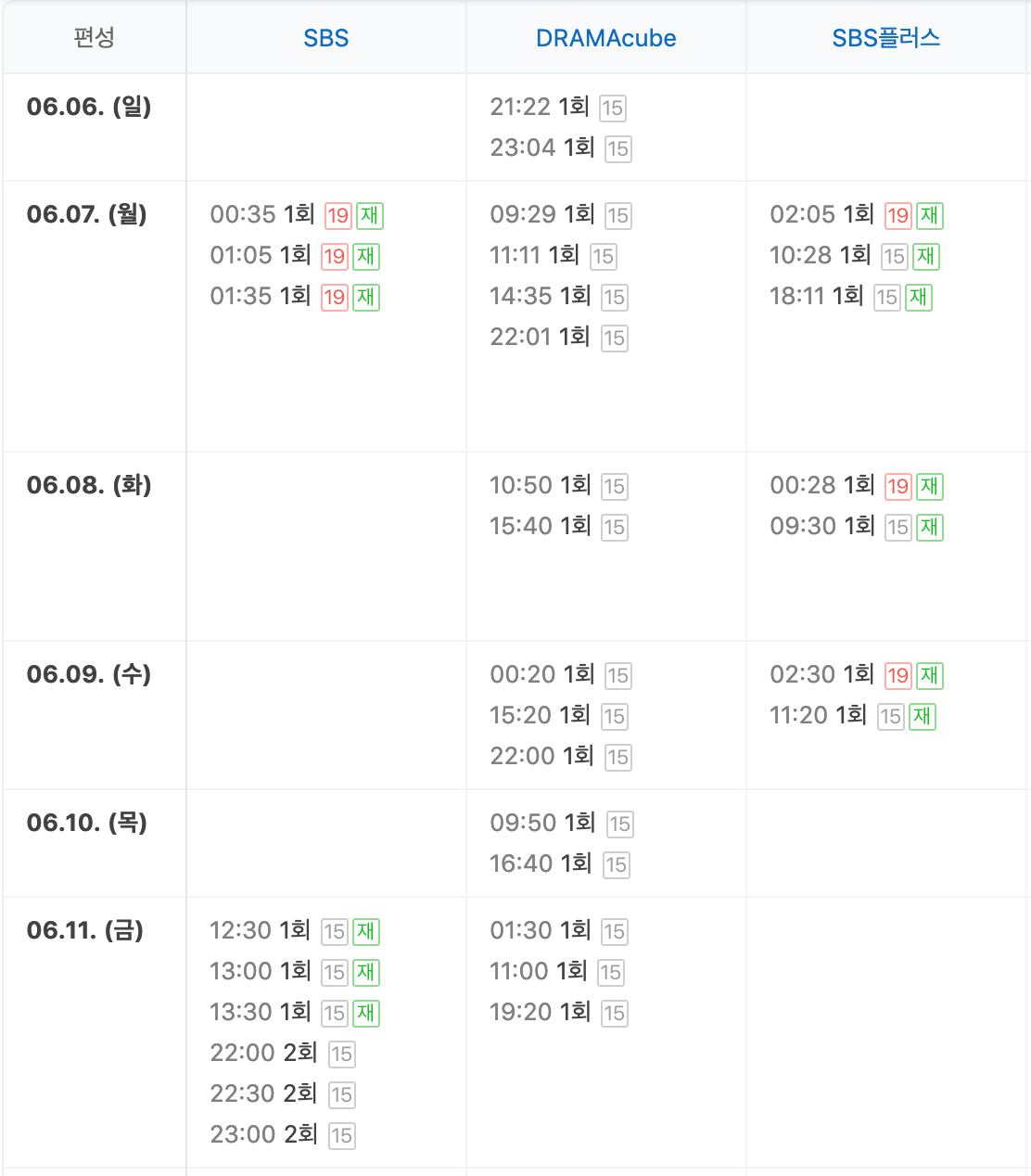 일요일부터 금요일까지 재방송 시간은 아래와 같다.