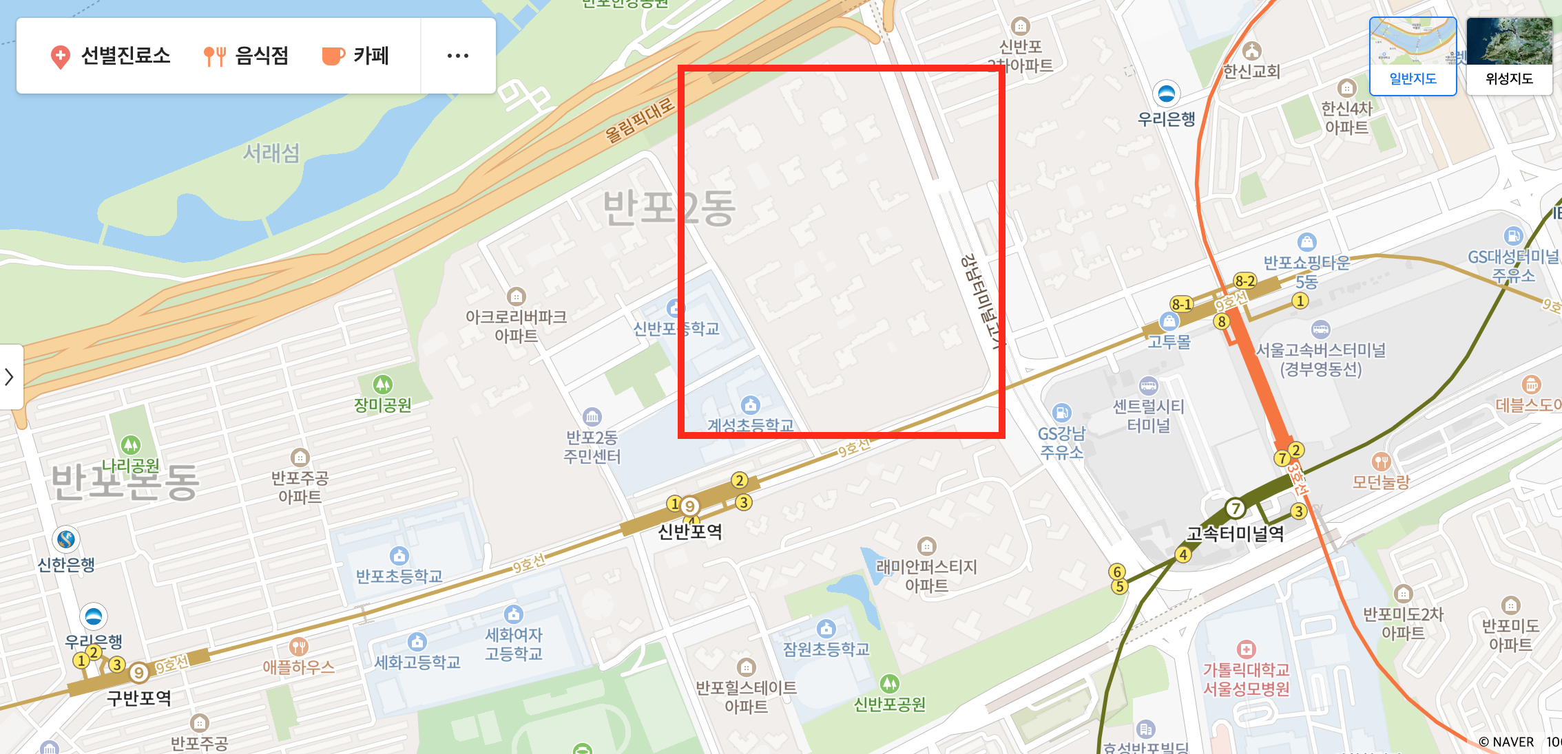 신반포역을 사이에 두고 건너편에는 래미안퍼스티지아파트, 조금만 더 가면 고속터미널도 가까운 편이다.