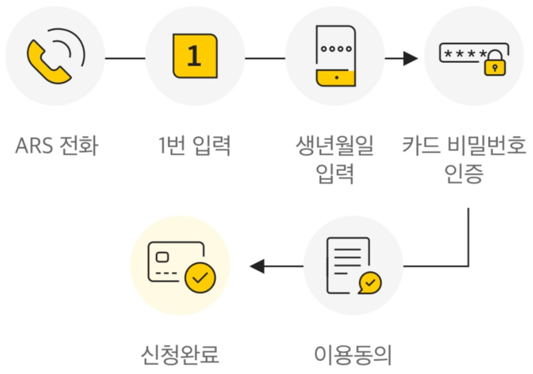 ARS 전화로 전화한 뒤, 1번을 누르고, 생년월일을 입력하고, 카드 비밀번호 인증하고, 이용동의를 하면 신청이 끝난다.