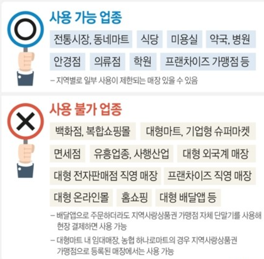 먼저, 일반적으로 전통시장, 동네마트를 비롯한 식당은 사용이 가능하다. 그외에도