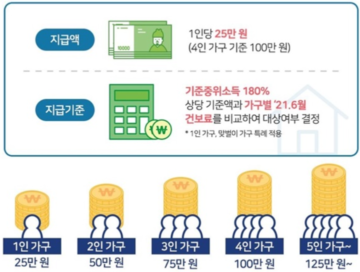 1인당 25만원이 지급되며, 4인 가구 기준은 당연히 100만원이 된다.