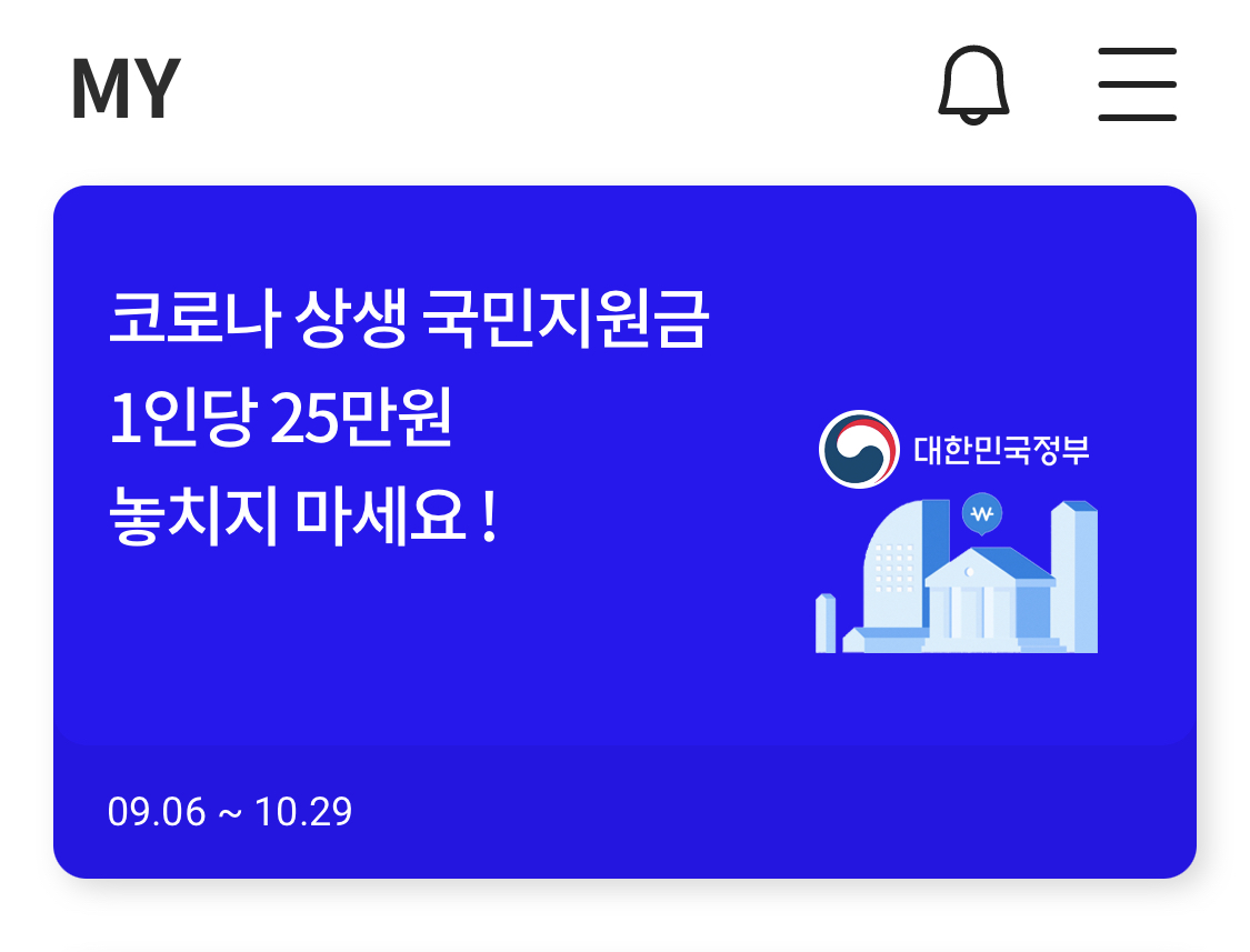 삼성카드의 경우도 앱을 실행시키면 첫 화면에 국민지원금 신청할 수 있는 배너가 보인다.