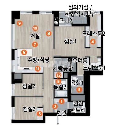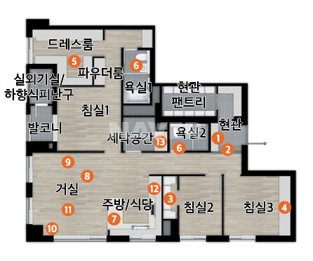 공통적으로 방 3개 화장실 2개, 계단식 아파트이다.